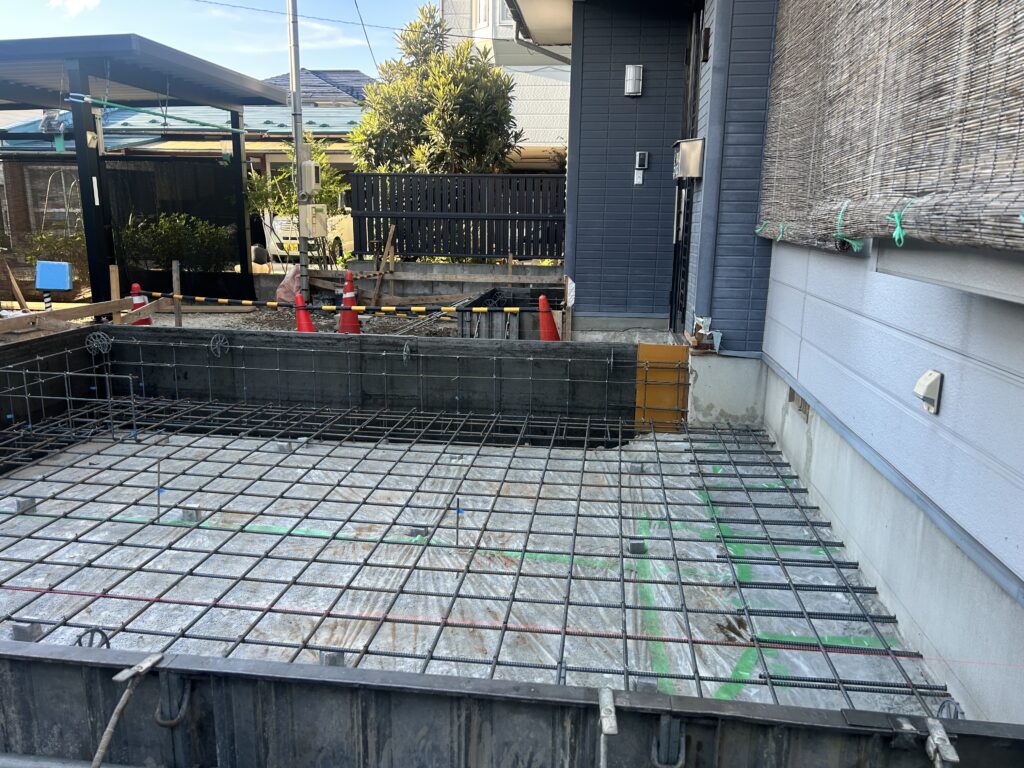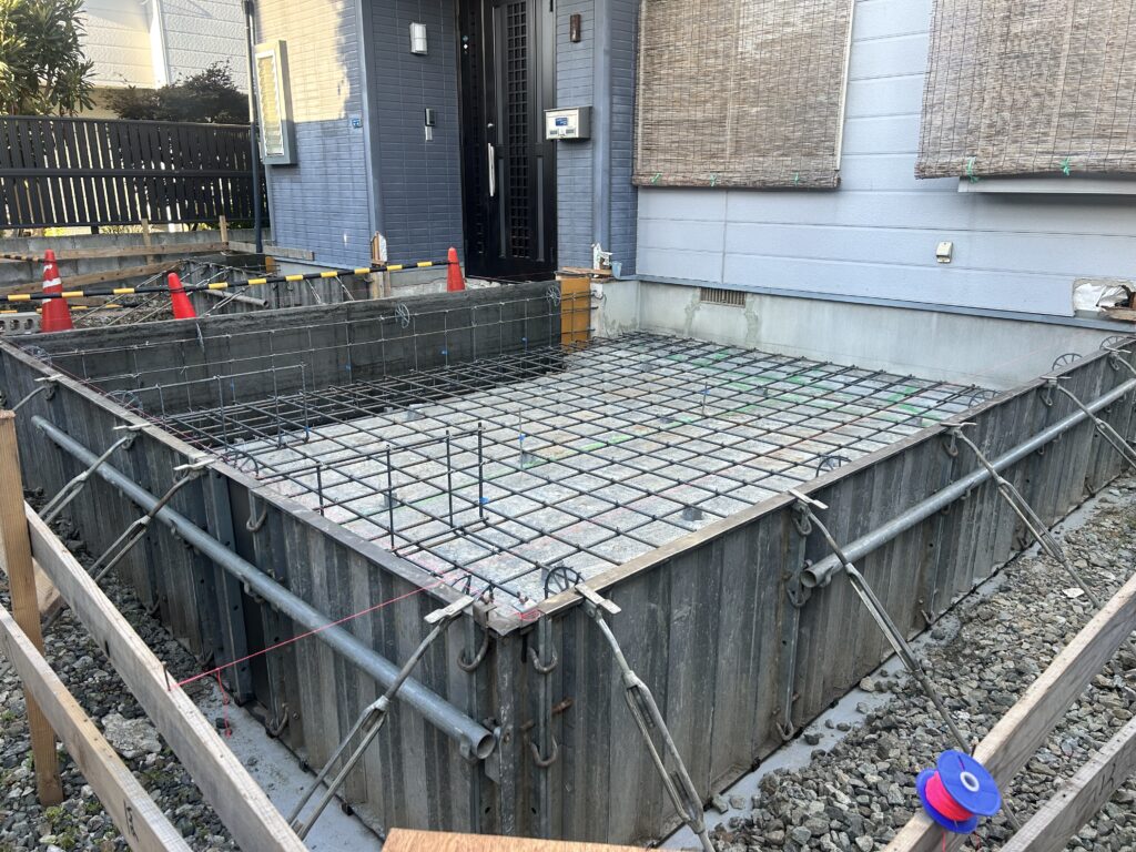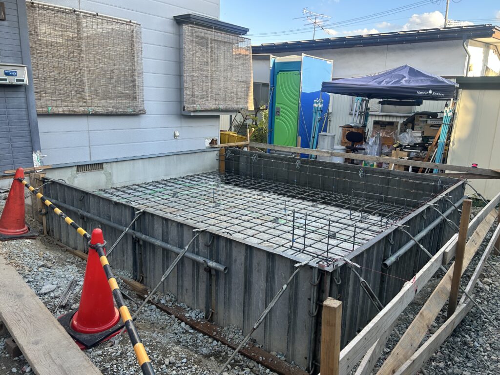 新築工事と違い、既存住宅との取り合い等が大変な部分がありますが、丁寧に、そして正確に基礎工事を進めています。